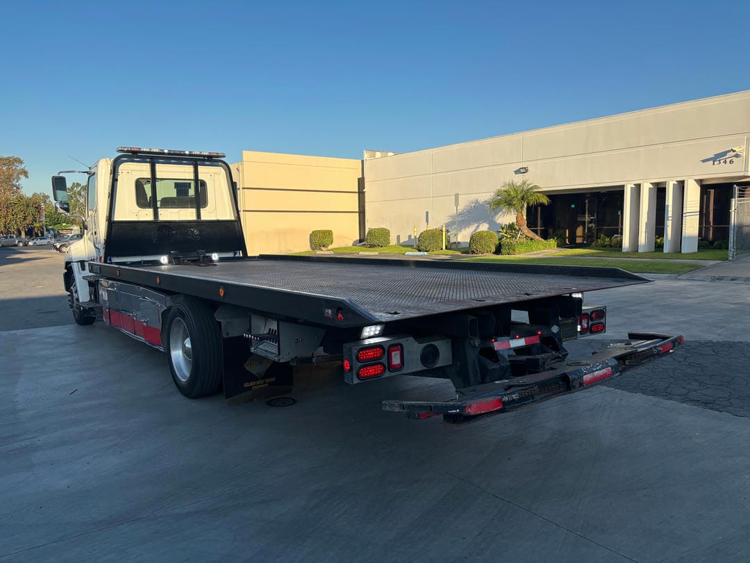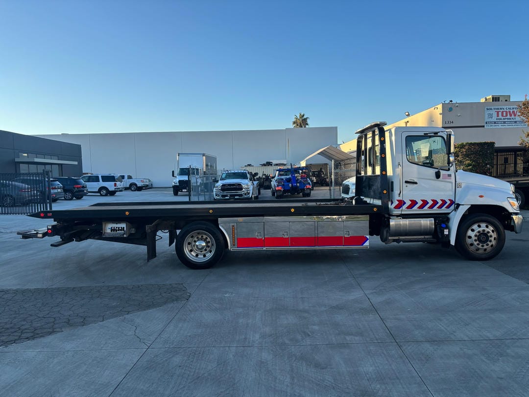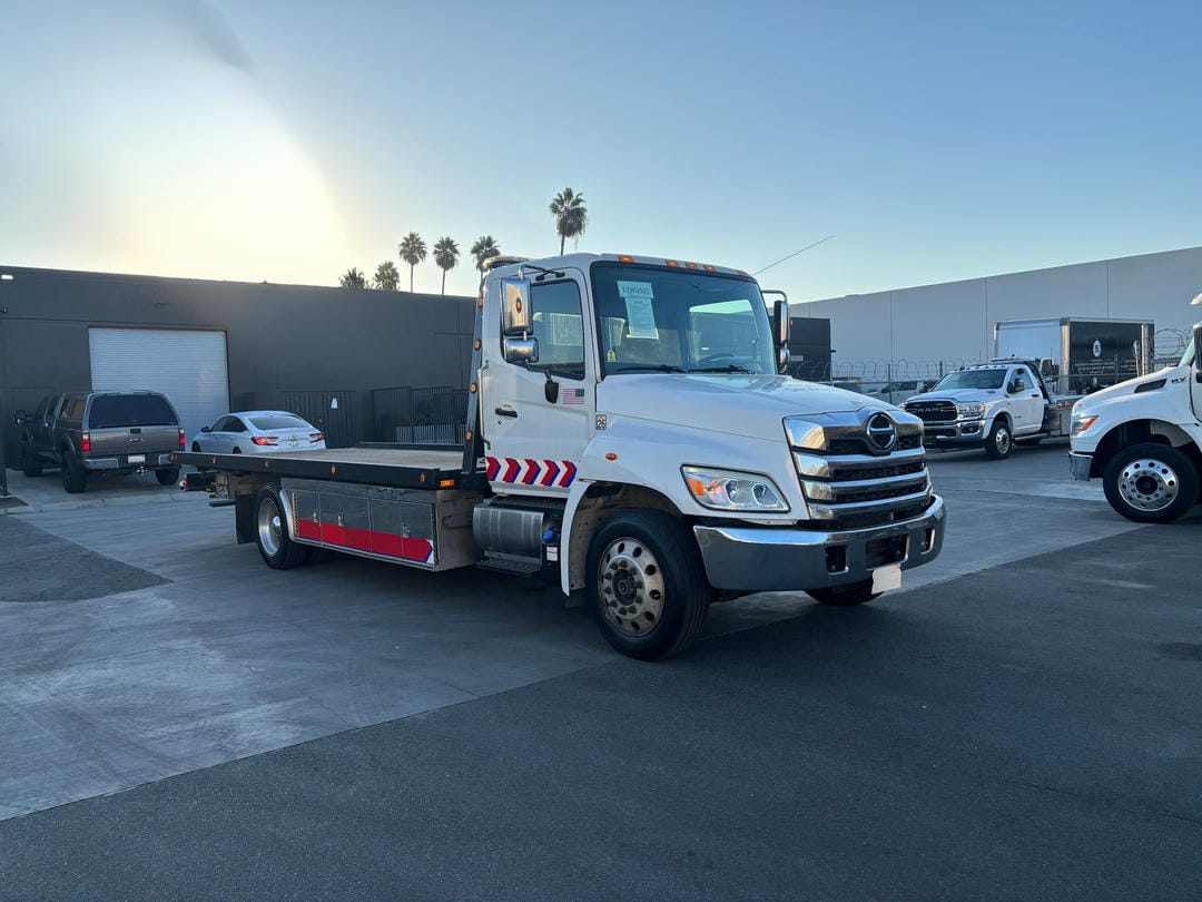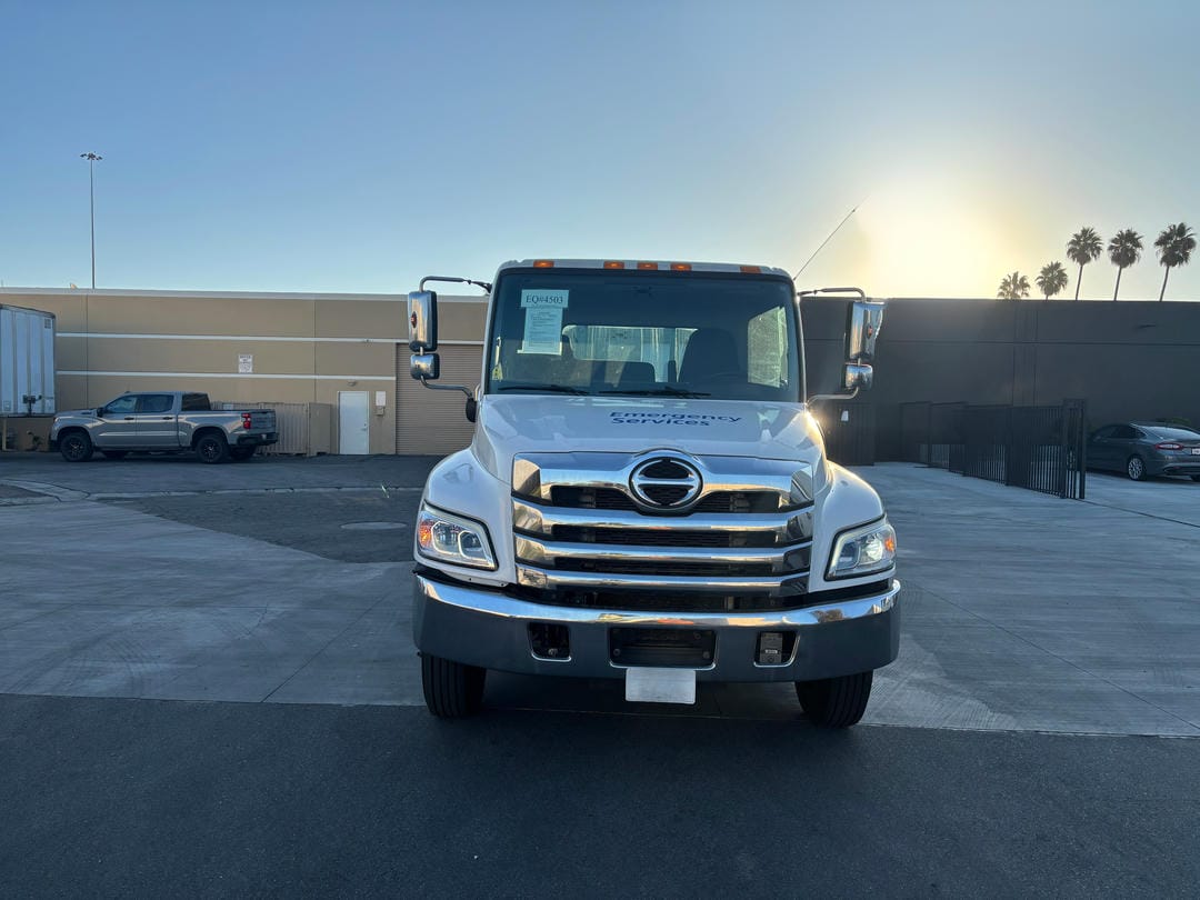 USED 2021 Hino L6 standard cab white, 25500 GVWR, 260HP Hino Engine, automatic 6 speed transmission, power windows, power door locks, power mirrors, air brakes, air ride, aluminum wheels w//255/70R22.5 tires.