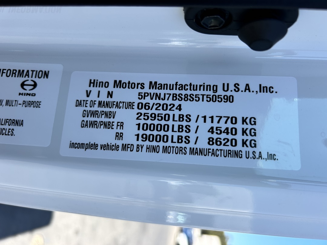NEW 2025 Hino Extended Cab white , 260HP CUMMINS 6.7L B6.7 diesel engine w/ Allison 2200 RDS automatic transmission, power door locks, windows and mirrors, aluminum wheels w/255/70R22.5 tires, air brakes, air ride.