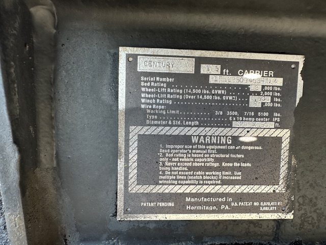 Used 21.5 Century S-12 ,12000lb Steel bed ,3500lb Under-lift "L" Arm Wheel lift, 8000lbd Hydraulic Winch Manual Clutch Release 3/8X50ft Winch Cable,Steel Removable Rail, Dual Control, 2-Steel 45" Tool Box, LED Light Bar, LED Work Lights