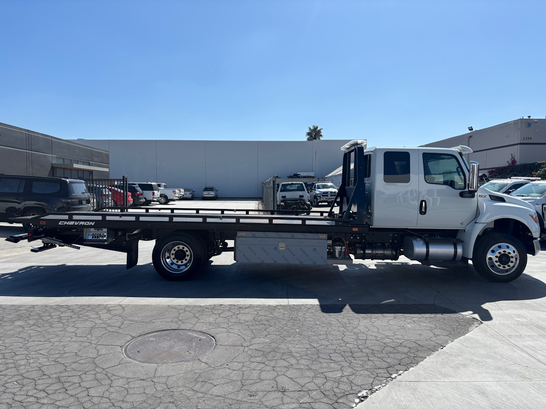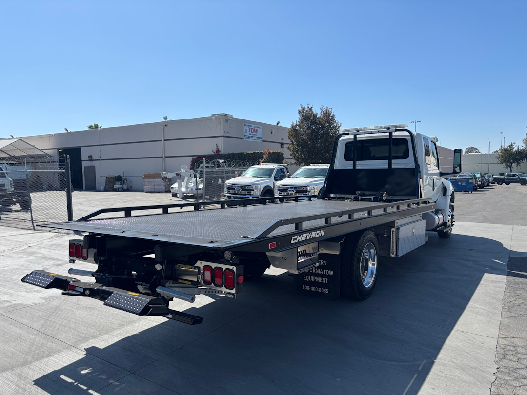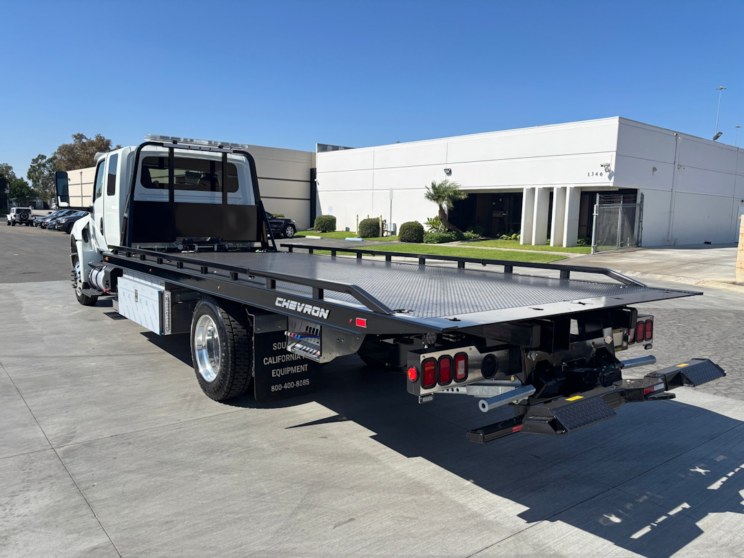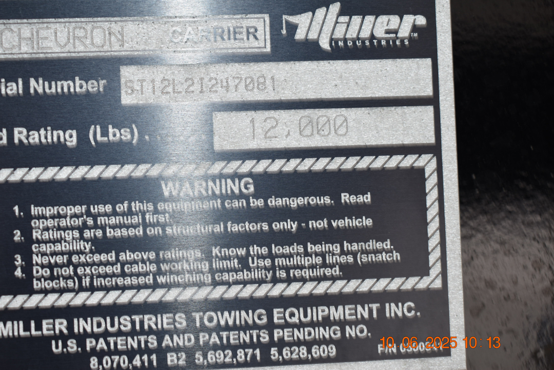 Chevron S-12 LCG 21.5' steel bed, removable steel tube rails, 12000lb bed capacity, steel pylon, dual lighted controls, 8000lb winch, manual handle release winch, "L" arm underlift, two tool boxes, LED lighting.